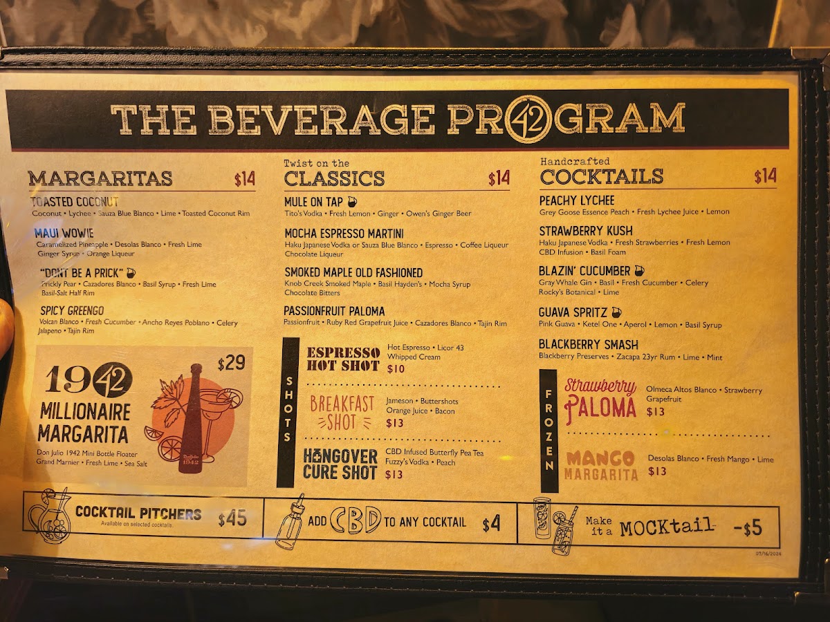 For those seeking refreshment, the bar offers an array of craft cocktails, including the highly recommended Blazin Cucumber. With attentive service and a lively atmosphere, Tap 42 promises a memorable dining experience for friends and families alike.